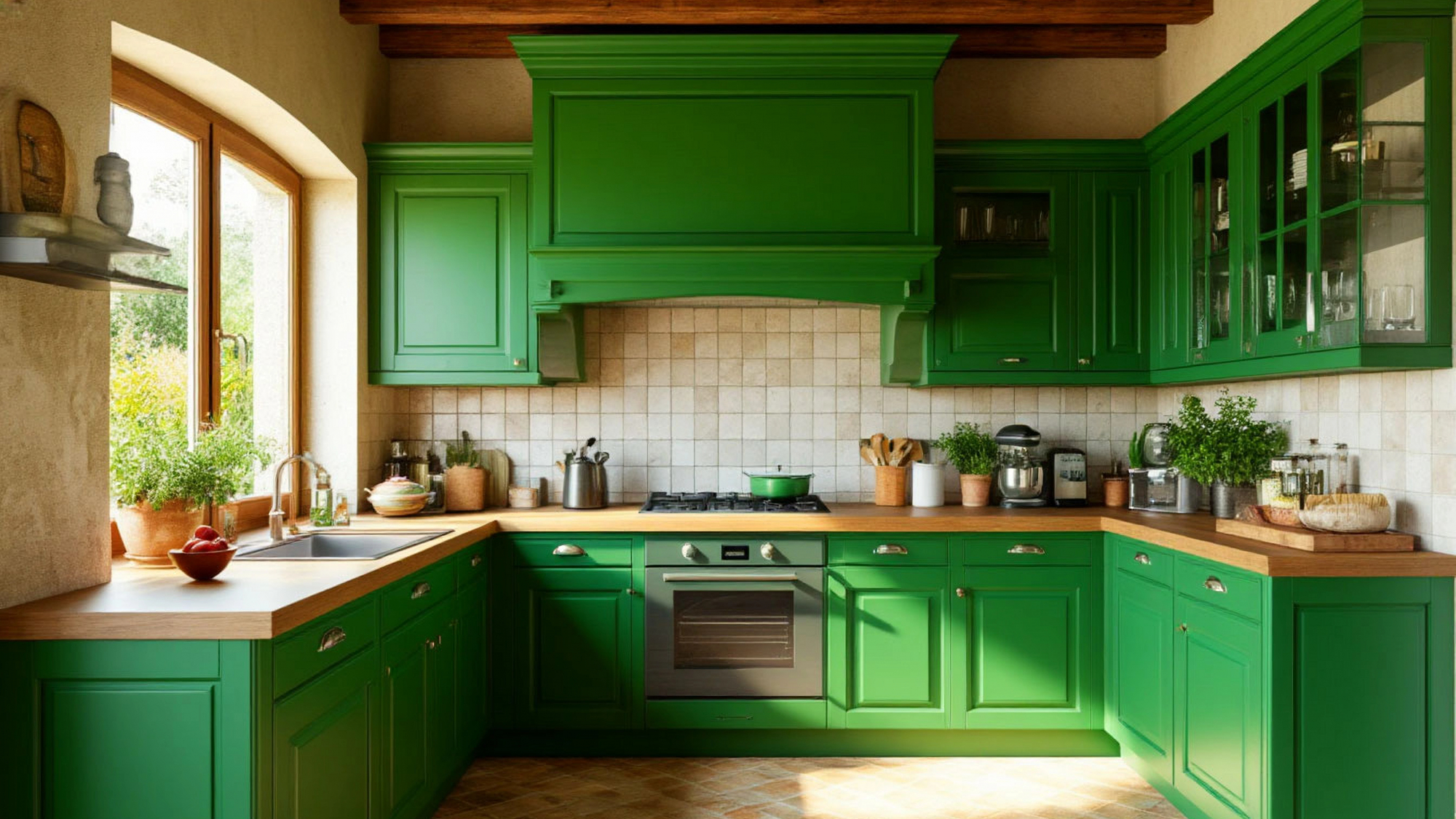 Отдельного внимания заслуживает столешница под орех, которая задаёт всей композиции правильный баланс. Тёплая древесная текстура смягчает зелёный цвет фасадов, добавляет уюта и визуальной плотности. Это сочетание выглядит очень по-итальянски: натурально, спокойно и уверенно. Ореховый оттенок подчёркивает глубину цвета, делает кухню более «вкусной» визуально и создаёт ощущение продуманности без излишней декоративности. Именно такие сочетания характерны для интерьеров, где ценят долговечность, тактильность и естественную красоту материалов.